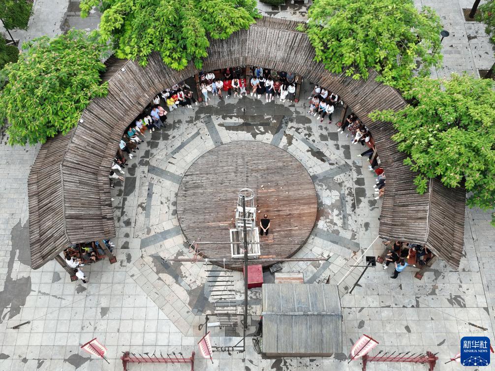 8月12日,在河北省滄州市吳橋雜技大世界景區江湖文化城,游客們觀(guān)看雜技藝人表演傳統雜技節目(無(wú)人機照片)。