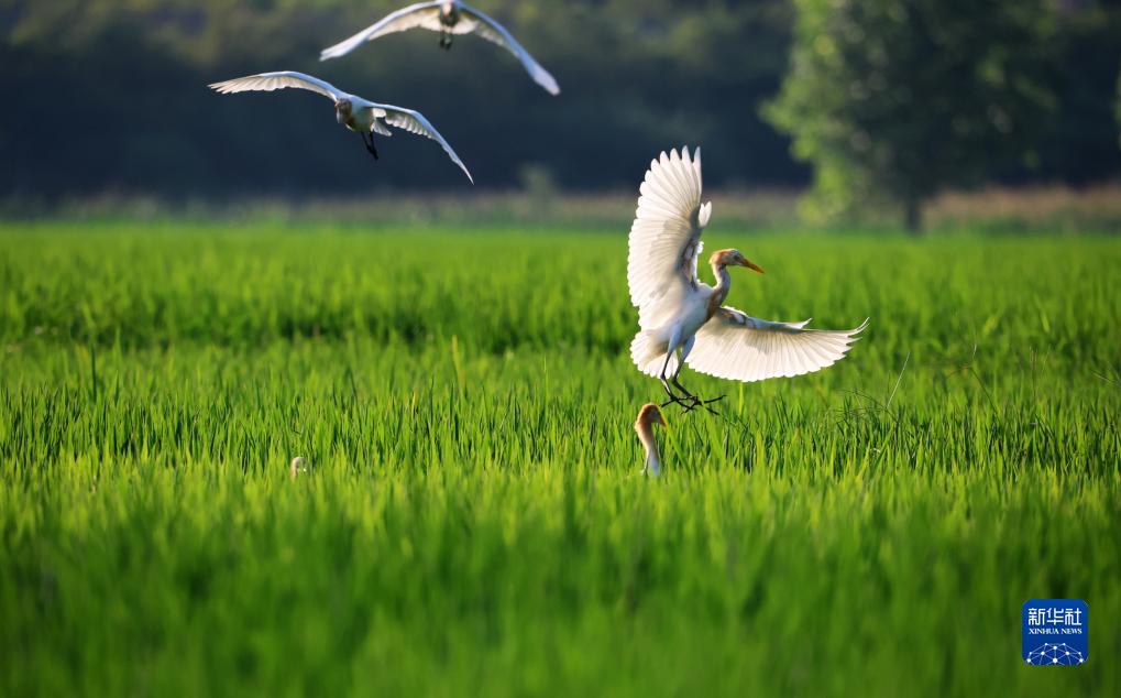 8月7日,鷺鳥(niǎo)在山東省臨沂市郯城縣郯城街道水稻田間飛舞。