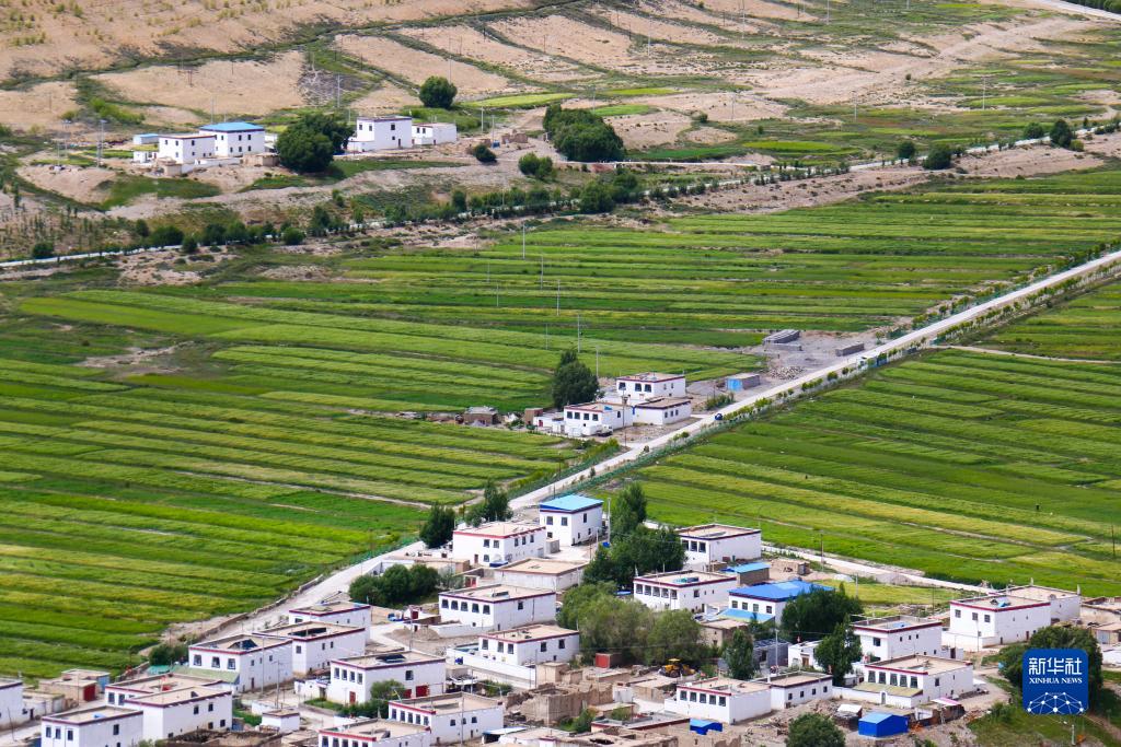 被青稞田點(diǎn)綴的西藏普蘭縣村莊(8月12日攝)。