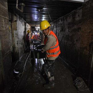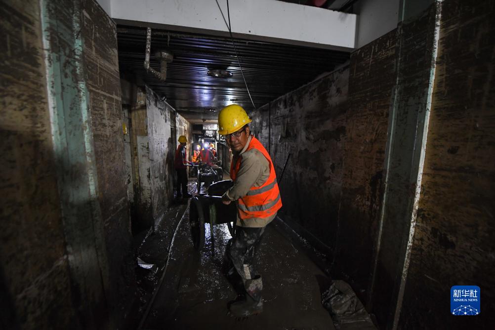 8月12日,在北京市門(mén)頭溝區醫院,因水災影響無(wú)法從事原本工作的受災群眾組成清淤隊伍,清理醫院地下室的淤泥和垃圾。