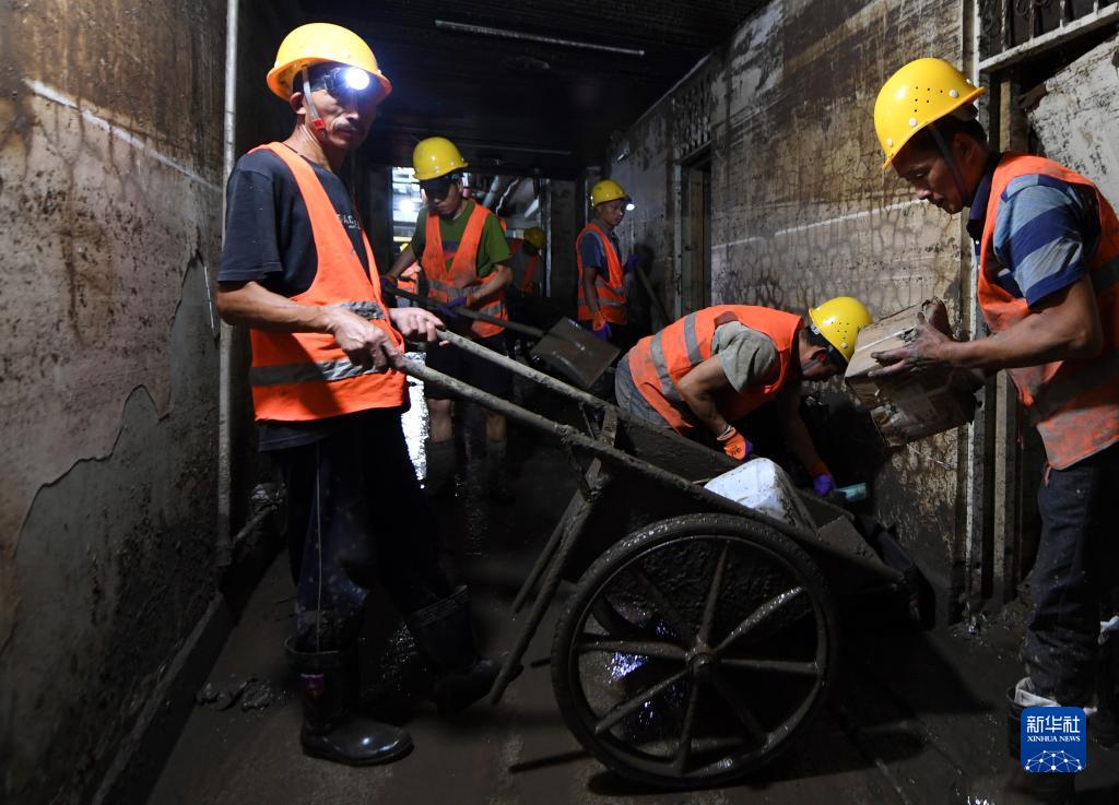 8月12日,在北京市門(mén)頭溝區醫院,因水災影響無(wú)法從事原本工作的受災群眾組成清淤隊伍,清理醫院地下室的淤泥和垃圾。新華社記者 鞠煥宗 攝