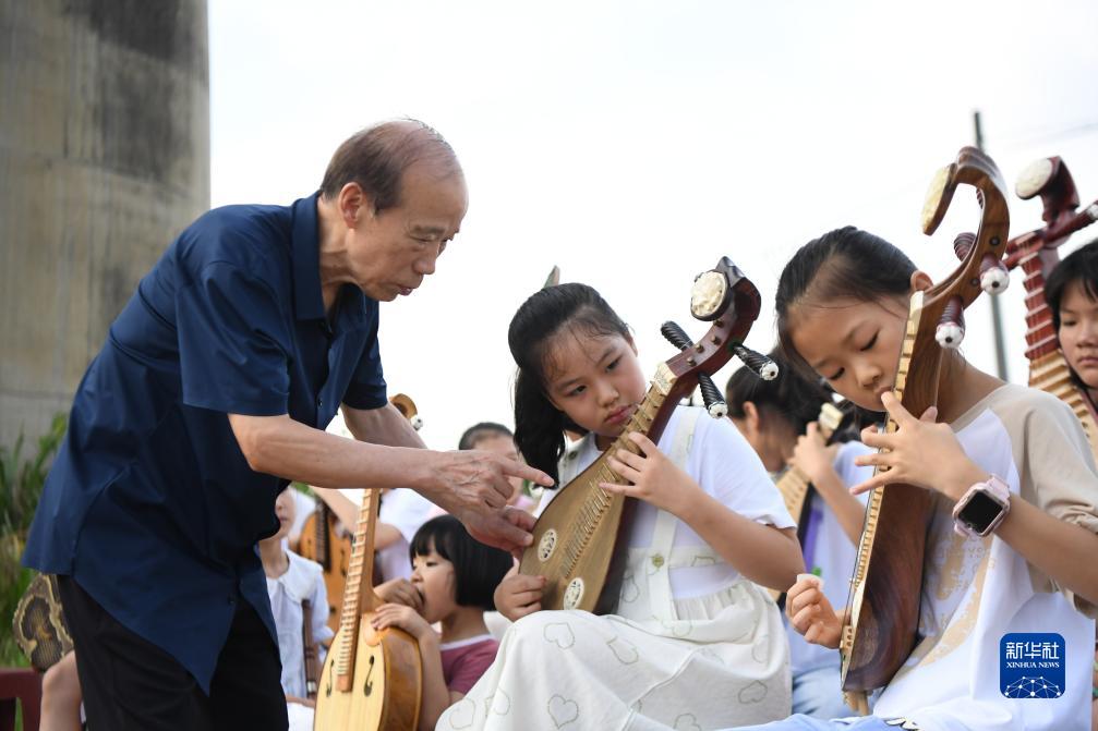 8月12日,李舒尤(左一)在枧頭洲村指導學(xué)生演奏柳琴。