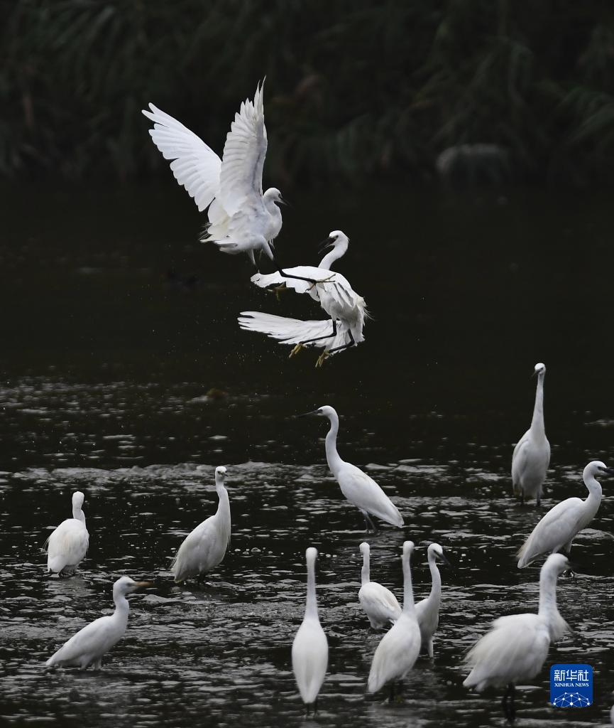 近日,成群的白鷺在山東省滕州市荊河水域覓食、飛舞。