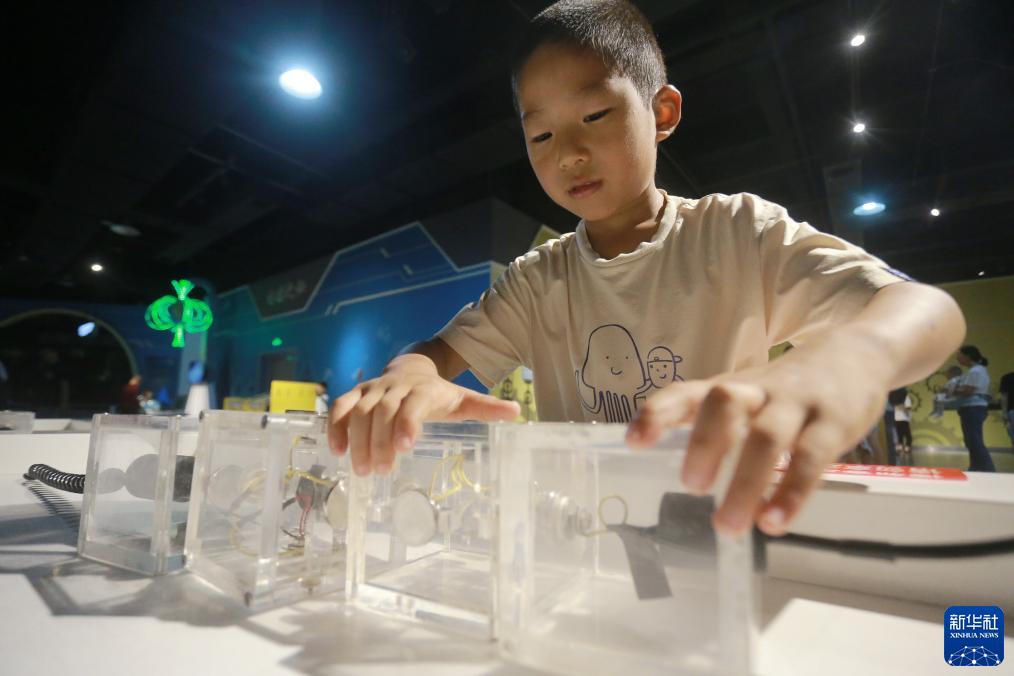8月13日, 小朋友在江蘇揚州科技館體驗“電路游戲”。