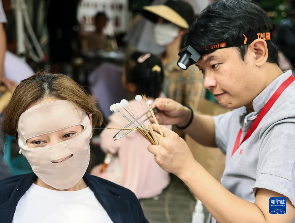 一位戴著(zhù)“臉基尼”的女顧客在享受采耳服務(wù)(7月31日攝)。