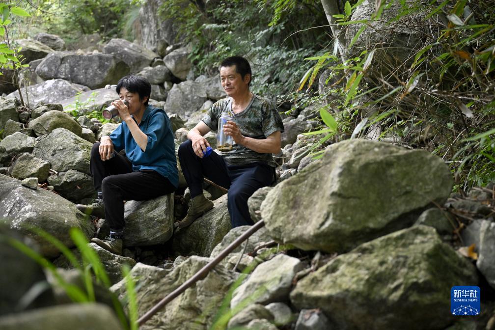 8月11日,在安徽天馬國家級自然保護區天堂寨管理站,王克東和高開(kāi)玉在巡山護林途中休息。