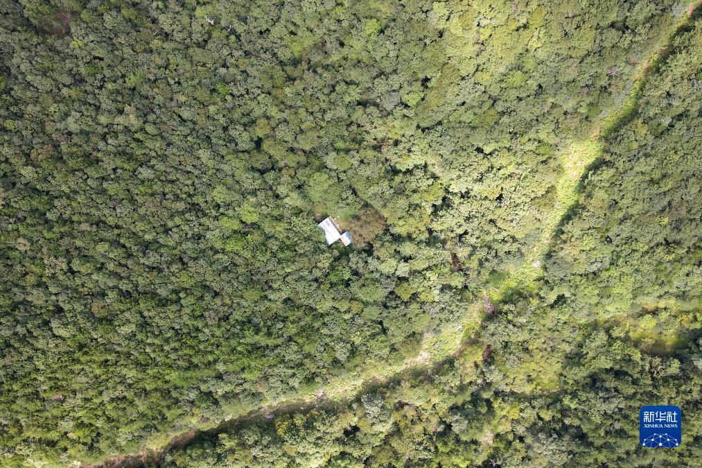 這是8月12日拍攝的安徽天馬國家級自然保護區天堂寨管理站的一處管護站。每年10月1日至次年4月30日的防火關(guān)鍵期,王克東夫妻倆會(huì )在這里長(cháng)期居?。o(wú)人機照片)。