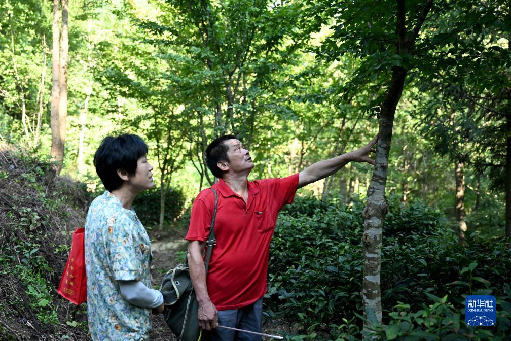 8月12日,在安徽天馬國家級自然保護區天堂寨管理站,王克東和高開(kāi)玉查看自己親手栽種的國家一級保護植物銀縷梅的生長(cháng)情況。