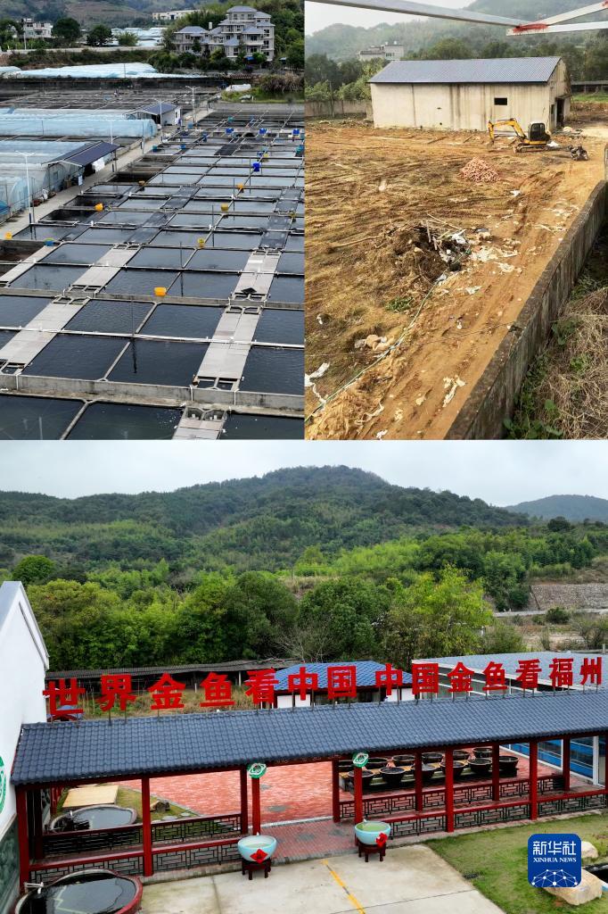 拼版照片,左上圖和下圖為:位于福州市閩侯縣荊溪鎮關(guān)中村的金魚(yú)養殖龍頭企業(yè)潘氏金魚(yú)養殖基地一角(2月14日攝,無(wú)人機照片);右上圖為:正在動(dòng)工開(kāi)建的潘氏金魚(yú)養殖基地(2016年攝,資料照片)。
