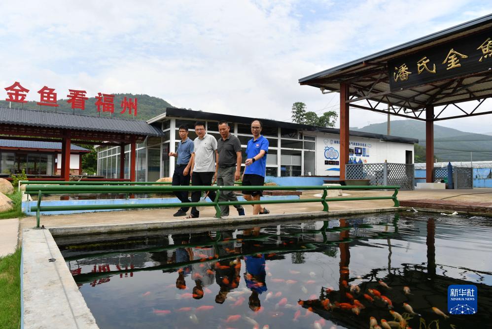 這是在福州市閩侯縣荊溪鎮關(guān)中村潘氏金魚(yú)養殖基地,科技特派員團隊與養殖場(chǎng)負責人潘國誠(右二)在養殖場(chǎng)(8月11日攝)。