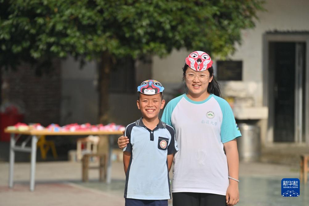 在廣西三江侗族自治縣獨峒鎮知了小學(xué),南通大學(xué)學(xué)生呂寶鳳(右)和小學(xué)生在展示臉譜作品(7月14日攝)。