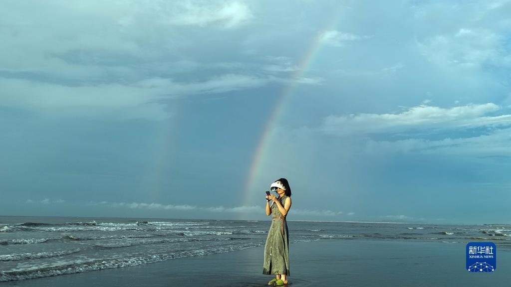 當日,一場(chǎng)晨雨過(guò)后,日出時(shí)分,在廣西東興的金灘,“國道之行 從雪山奔向大?!眻蟮澜M偶遇了朝陽(yáng)與彩虹“共舞”的奇妙景觀(guān)。