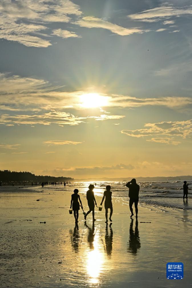 8月14日,日出時(shí)分,游客在金灘游玩。