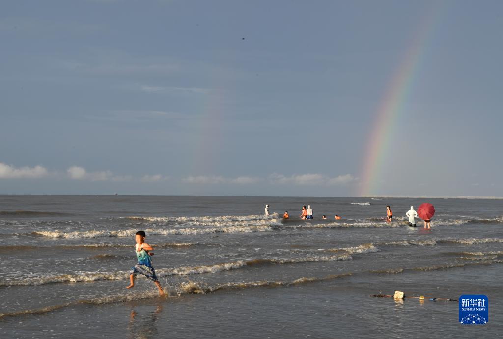 8月14日,游客在金灘出現的彩虹下游玩。