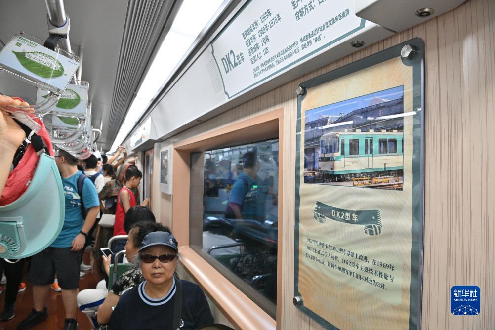 8月14日拍攝的北京地鐵一號線(xiàn)“時(shí)光列車(chē)”車(chē)廂內展示的DK2型車(chē)介紹材料。