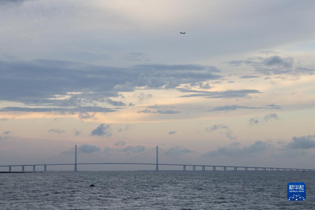 一架飛機飛過(guò)上海長(cháng)江大橋上空(2023年7月26日攝)