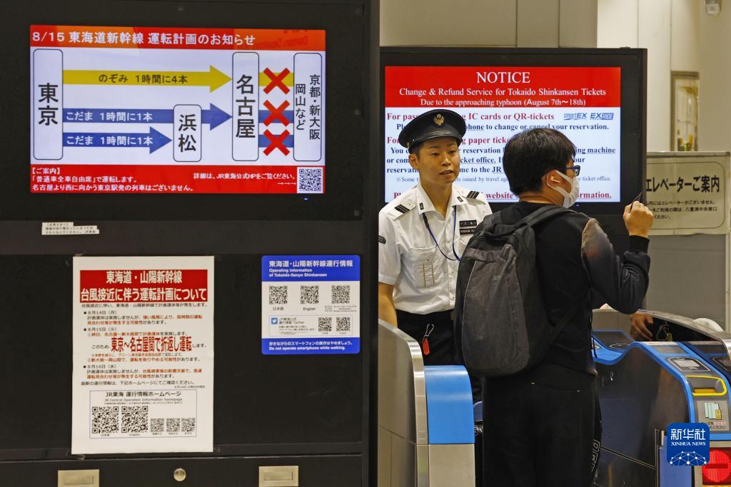 8月15日,日本東京站的電子告示牌顯示,受惡劣天氣影響,東海道新干線(xiàn)部分路段停運。