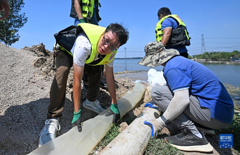 8月15日,應急搶險隊在天津市靜海區臺頭鎮清北地區北圍埝上調整抽水袋。