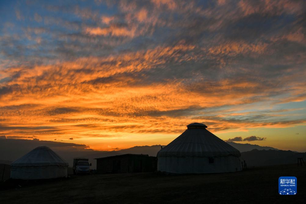 晚霞映照下的新疆昌吉市廟爾溝鄉索爾巴斯陶牧場(chǎng)(8月13日攝)。
