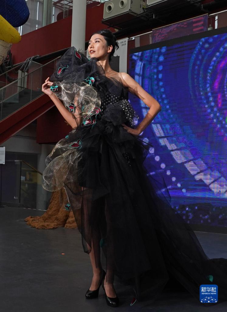 8月15日,模特在藝術(shù)節開(kāi)幕式上展示用廢棄布料設計制作的禮服。