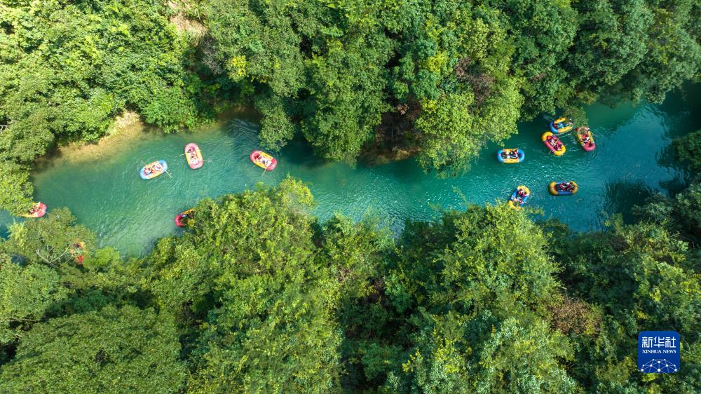 8月15日,游客在貴州省荔波小七孔風(fēng)景區體驗漂流項目(無(wú)人機照片)。