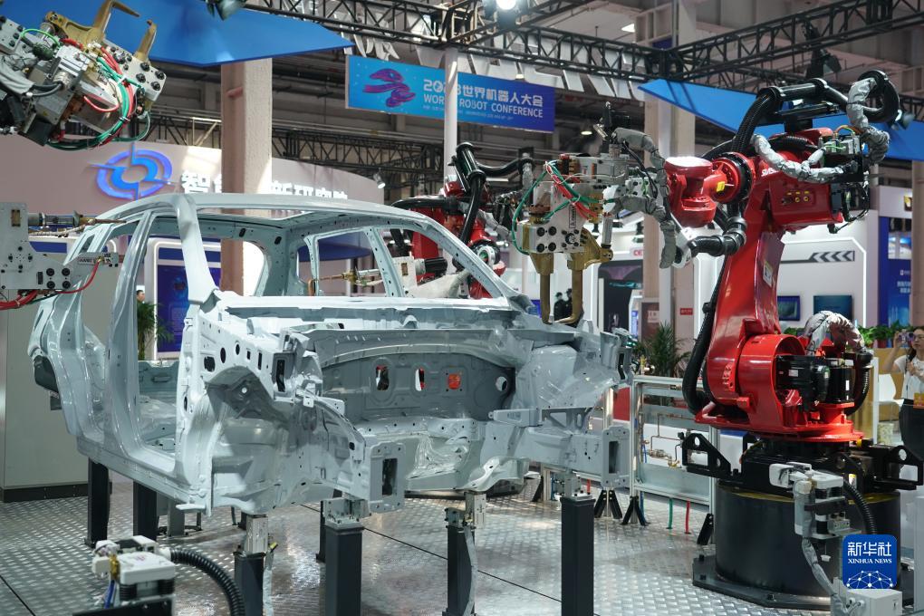 8月16日在2023世界機器人大會(huì )現場(chǎng)拍攝的白車(chē)身焊點(diǎn)機器人工作站。