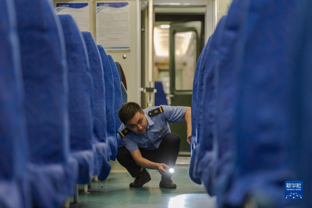 8月15日,重慶客運段列車(chē)長(cháng)任煉在重慶西客車(chē)整備所檢查列車(chē)隱蔽部位。