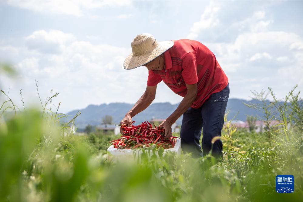 8月15日,村民在重慶市石柱土家族自治縣龍沙鎮長(cháng)坪村辣椒種植基地收獲辣椒。