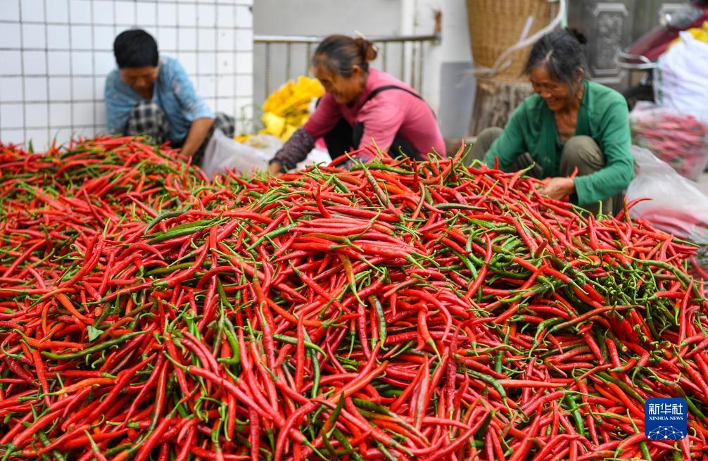 8月15日,重慶市石柱土家族自治縣龍沙鎮長(cháng)坪村村民分揀鮮辣椒。