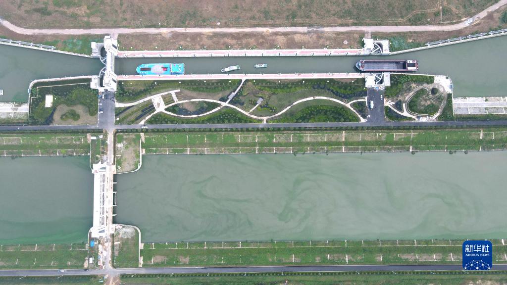 8月16日,船只排隊等待通過(guò)引江濟淮工程派河口船閘(無(wú)人機照片)。