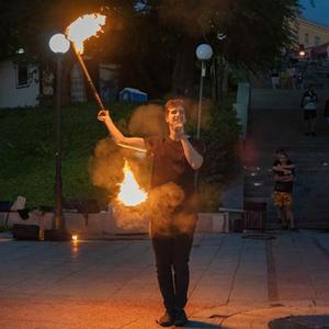 8月16日,一名男子在俄羅斯遠東城市符拉迪沃斯托克阿穆?tīng)枮车膹V場(chǎng)上表演火藝。