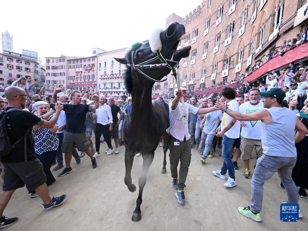 8月16日,在意大利錫耶納,人們聚集在獲勝馬匹周?chē)?/p>