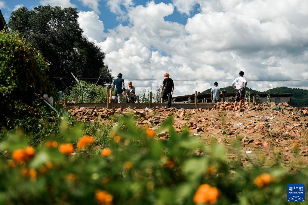 工作人員對舒蘭市開(kāi)原鎮模范村的受損房屋進(jìn)行重建工作(8月16日攝)。