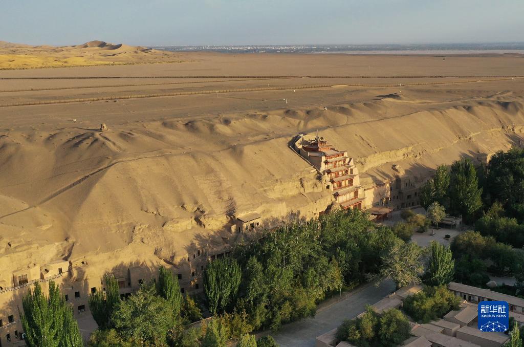 在敦煌莫高窟崖體頂部的戈壁帶和沙地上布設有風(fēng)沙、環(huán)境等多種監測設備以及安防監控系統,為莫高窟的保護提供了實(shí)時(shí)數據支持和安全保護屏障(8月4日攝,無(wú)人機照片)。