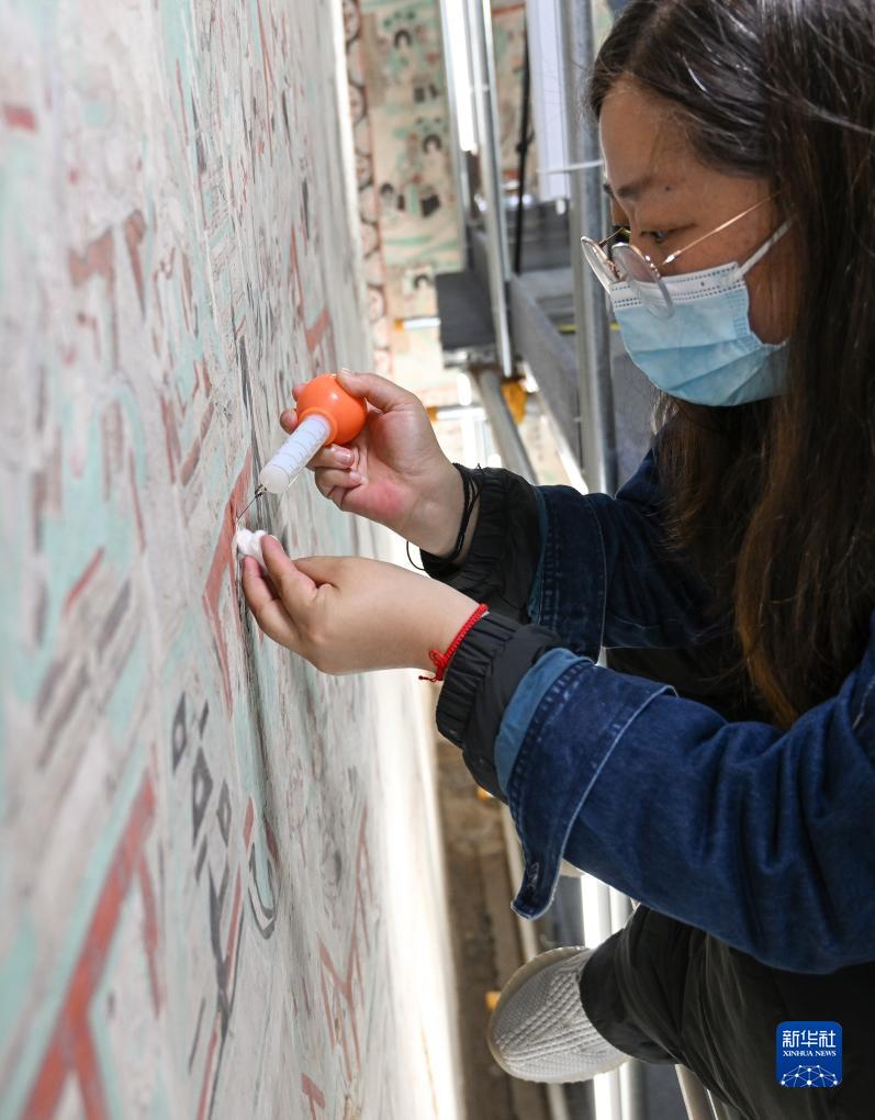 在敦煌莫高窟正在保護修繕的第55窟內,文保工作者對壁畫(huà)進(jìn)行加固修復(8月3日攝)。