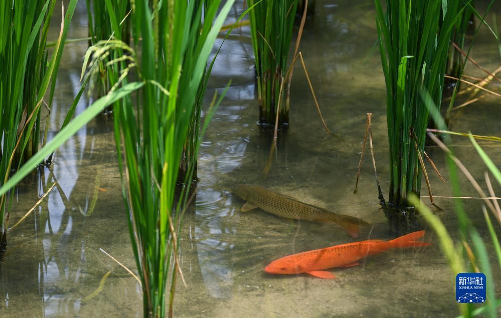 8月17日在青田縣方山鄉田魚(yú)養殖戶(hù)吳勇強的稻田里拍攝的養殖的田魚(yú),當地稻魚(yú)共生系統給百姓帶來(lái)了“一畝田、百斤魚(yú)、千斤稻、萬(wàn)元錢(qián)”的良好收益。