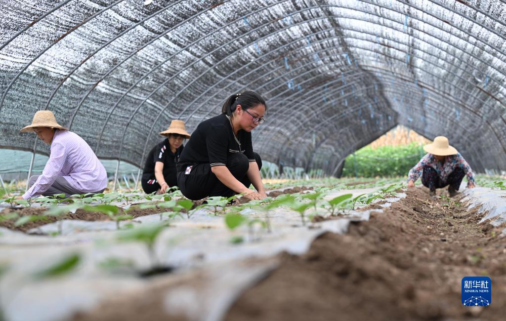 8月16日,余青青(左三)和工人一起在樅陽(yáng)縣青園心家庭農場(chǎng)的大棚內除草。
