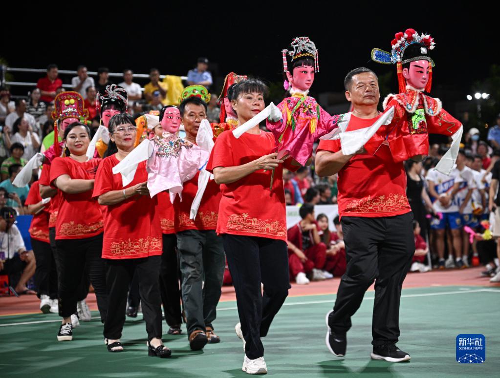 在“村排”決賽現場(chǎng),演員帶著(zhù)具有文昌特色的公仔戲木偶亮相球場(chǎng)(8月13日攝)。