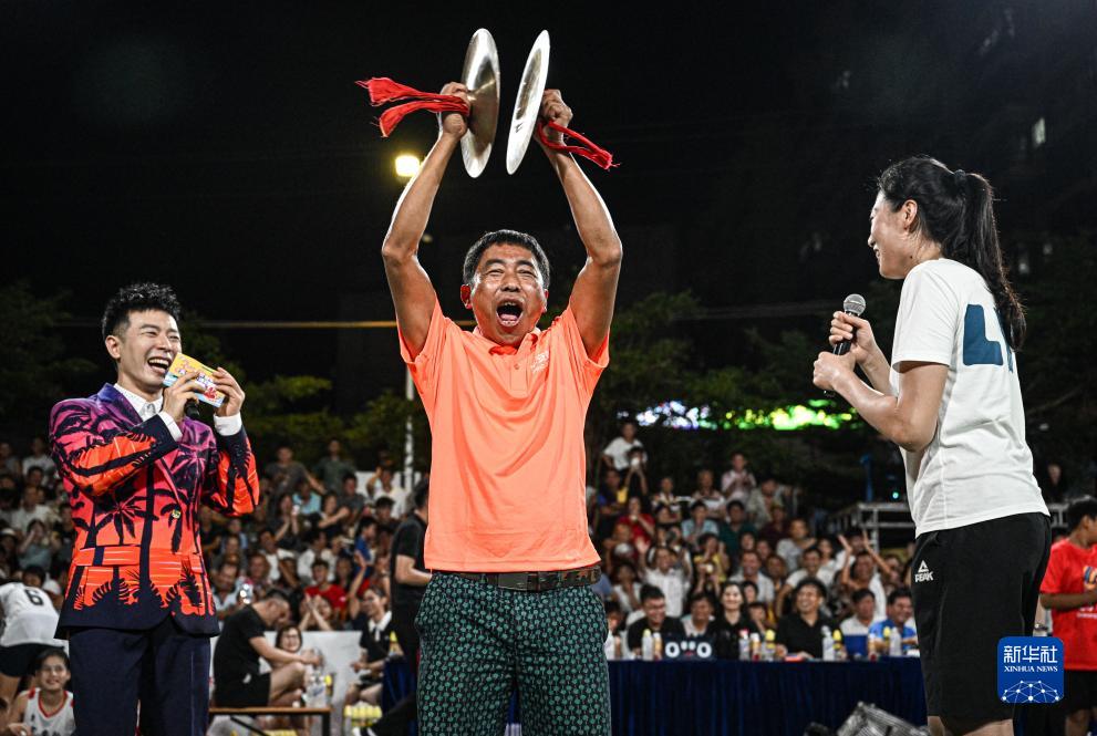 “村排”鋪前站比賽期間,龍樓鎮隊教練黃梓(中)與前中國女排球員劉晏含互動(dòng)交流(7月21日攝)。