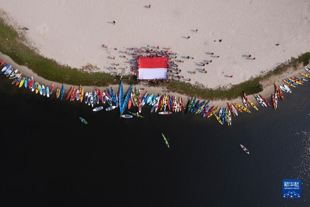 8月17日,在印度尼西亞雅加達安卒海灣,水上運動(dòng)愛(ài)好者展開(kāi)印尼國旗,慶祝獨立日(無(wú)人機照片)。