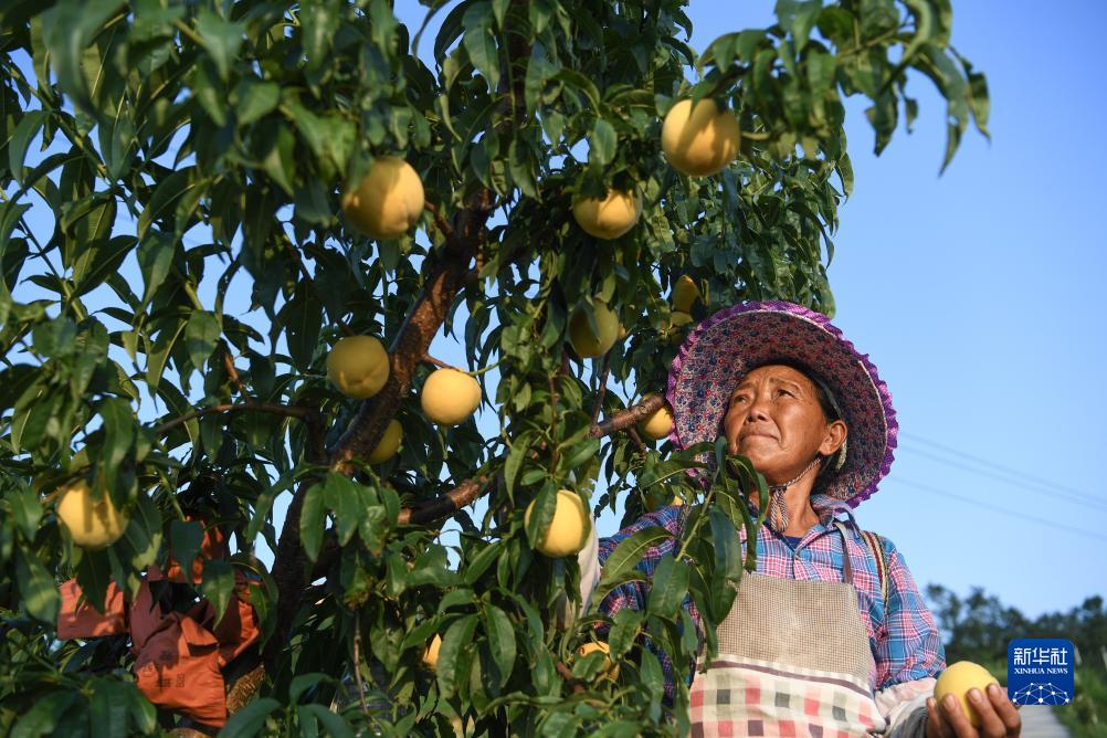 8月17日,村民在貴州省貴定縣德新鎮新鋪村黃桃種植基地采摘黃桃。