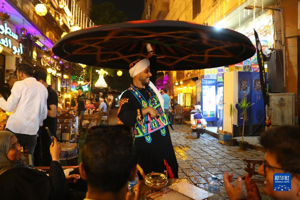 一名藝人為埃及開(kāi)羅哈里里市場(chǎng)夜市一家店鋪的顧客表演大裙舞(7月28日攝)。