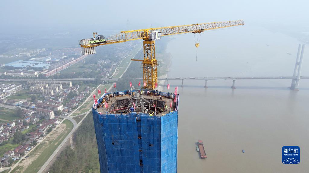 8月18日拍攝的京臺高速銅陵長(cháng)江公鐵大橋3號主塔封頂施工現場(chǎng)(無(wú)人機照片)。