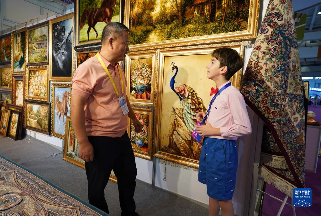 一名伊朗小男孩(右)在展位上向參觀(guān)者介紹掛毯(8月16日攝)。