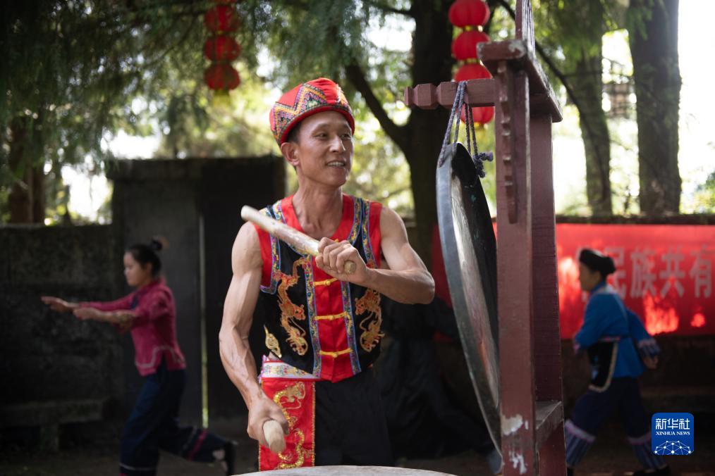 8月18日,舍米湖村村民彭成兵在擺手舞中擊鼓敲鑼。