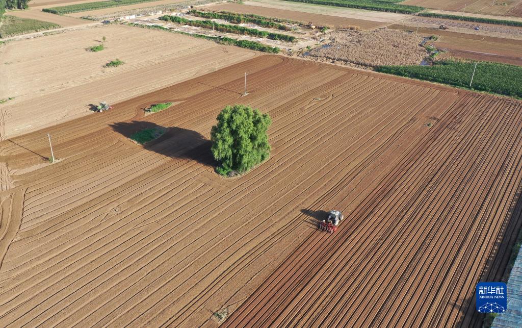 8月18日,農業(yè)機械在涿州市刁窩鎮潘各莊村進(jìn)行復耕補種作業(yè)(無(wú)人機照片)。