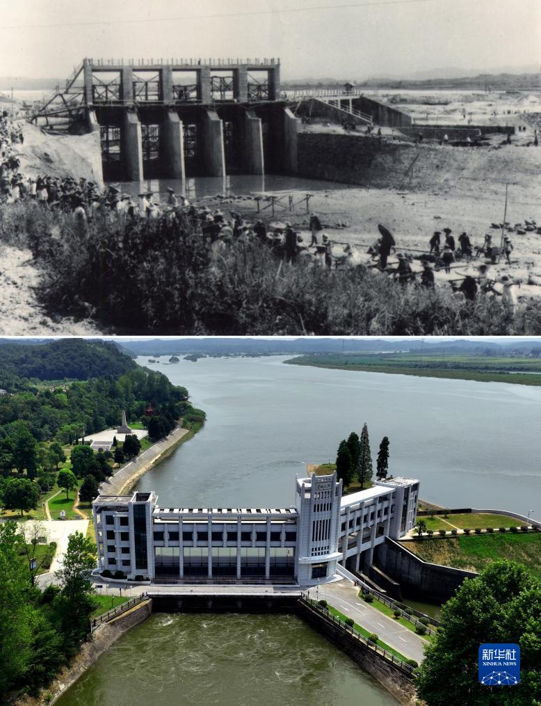 這是一張拼版照片。上圖為:1959年拍攝的位于安徽省六安市裕安區的淠河總干渠渠首橫排頭水利樞紐(新華社發(fā) 田準攝);下圖為:2023年8月18日拍攝的淠河總干渠渠首橫排頭水利樞紐(無(wú)人機照片,新華社記者杜宇攝)。