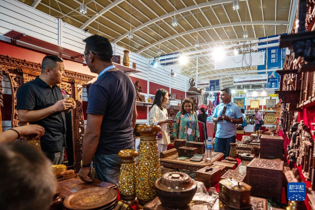 8月18日,參觀(guān)者在第七屆中國—南亞博覽會(huì )尼泊爾展區參觀(guān)、選購商品。