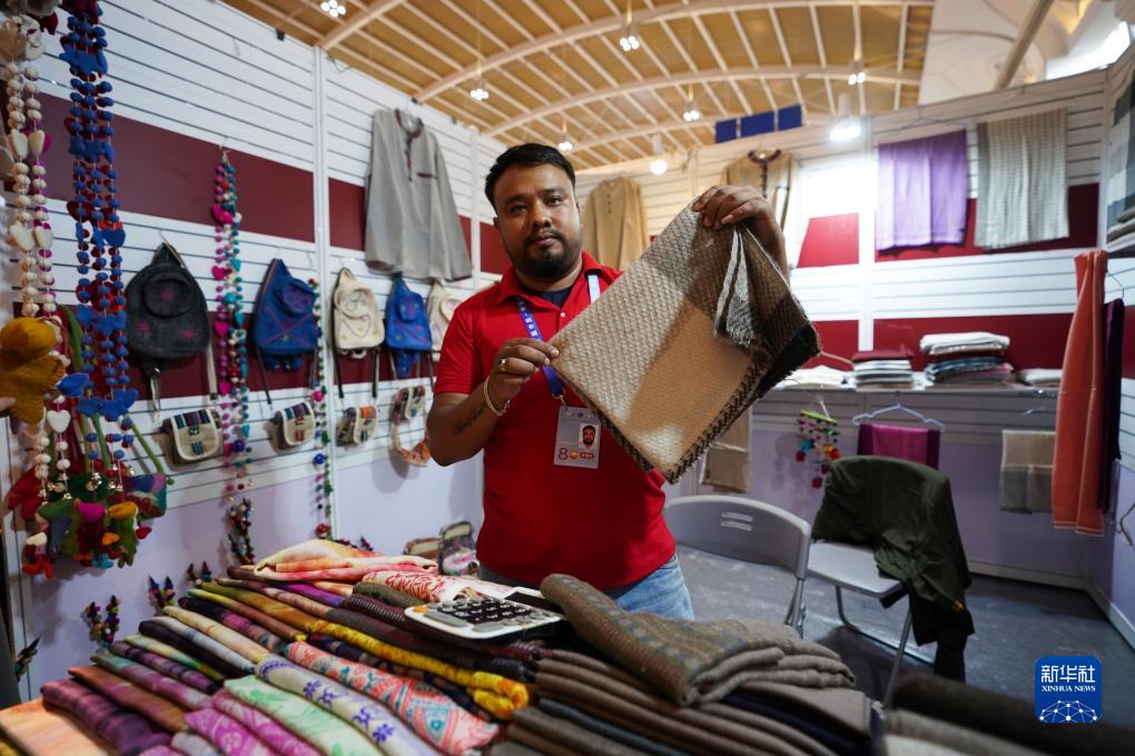 在第七屆中國—南亞博覽會(huì )上,一名來(lái)自尼泊爾的展商在展示圍巾(8月18日攝)。