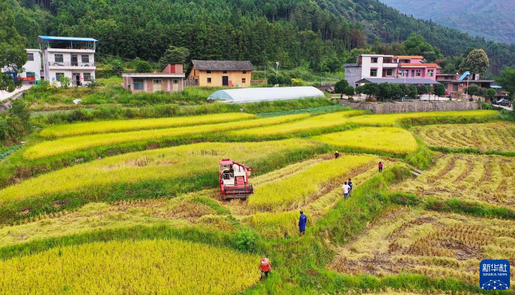 8月20日,湖南省永州市新田縣金陵鎮下蘭沖村,村民駕駛農機收割水稻(無(wú)人機照片)。